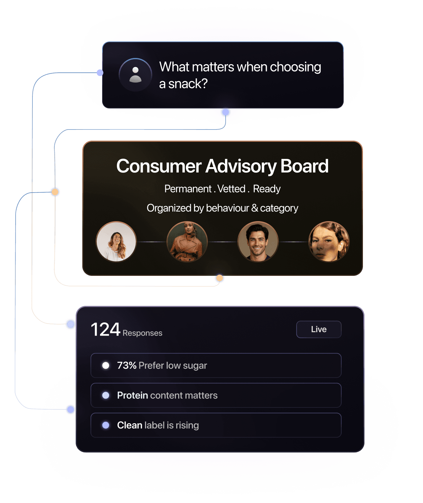 Vytal Voices builds and maintains permanent, vetted consumer panels organized around the behaviors and categories you care about. Instead of starting from scratch every time you have a question, you ask the same trusted group — and every answer builds on the last.